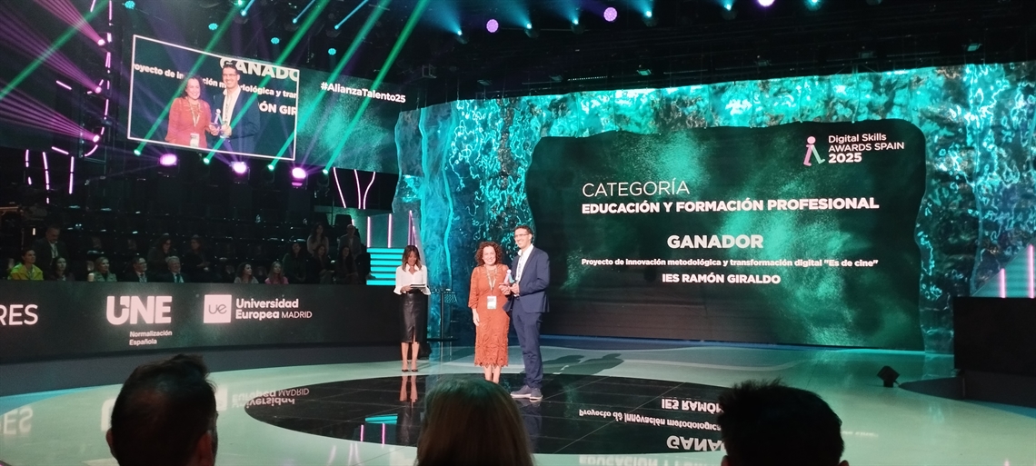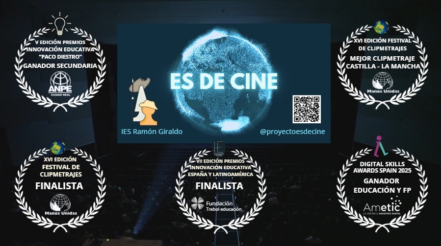 El proyecto Es de cine, impulsado y coordinado por Fran Medina como responsable del área de Religión católica del IES Ramón Giraldo de Villanueva de los Infantes ha sido galardonado en la categoría de Educación y Formación Profesional de los Digital Skills Awards Spain 2025, cuya gala se celebró el 23 de octubre en el VIII Foro de la Alianza por el Desarrollo del Talento Digital, en los estudios de Mediaset España.