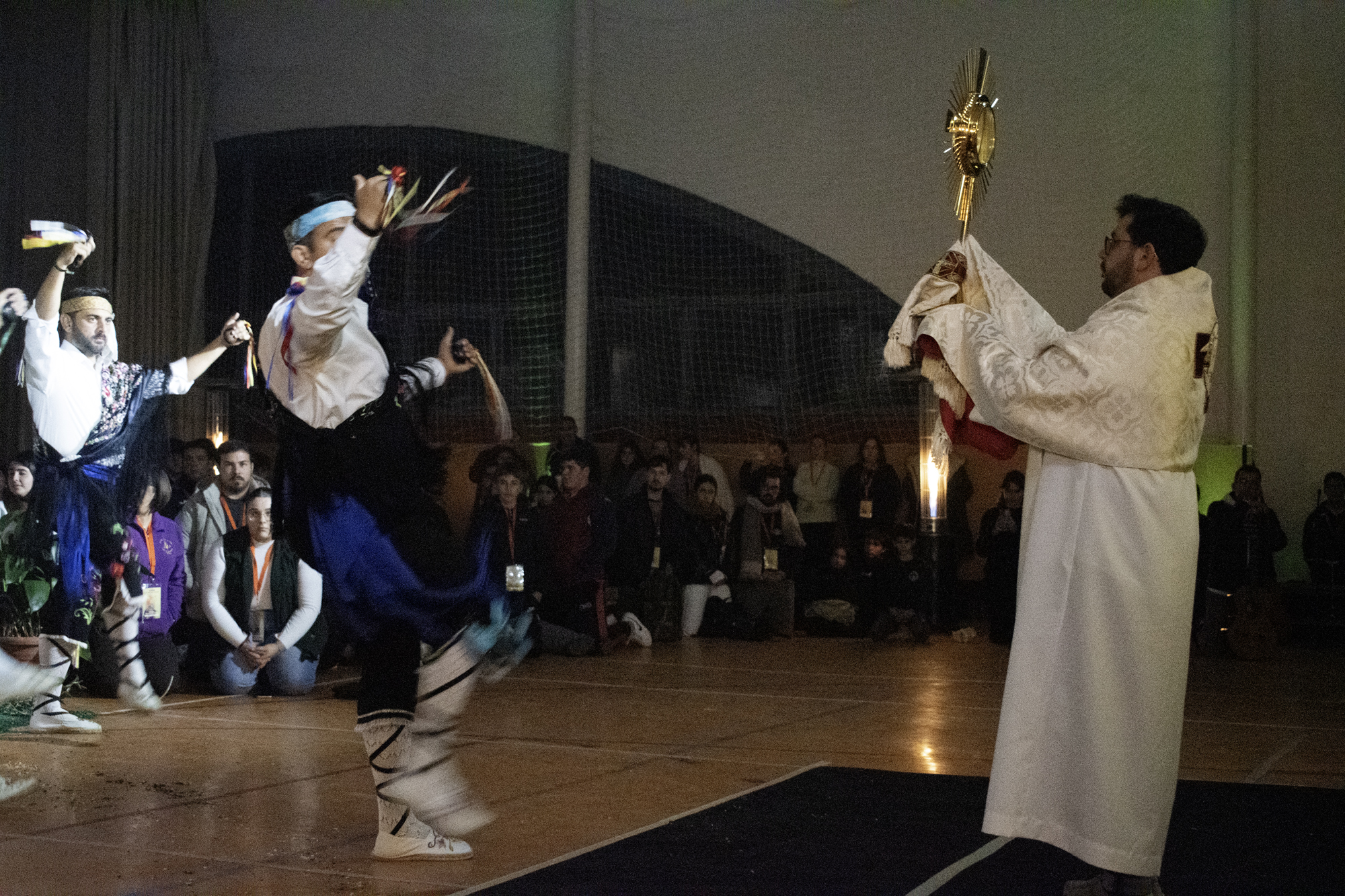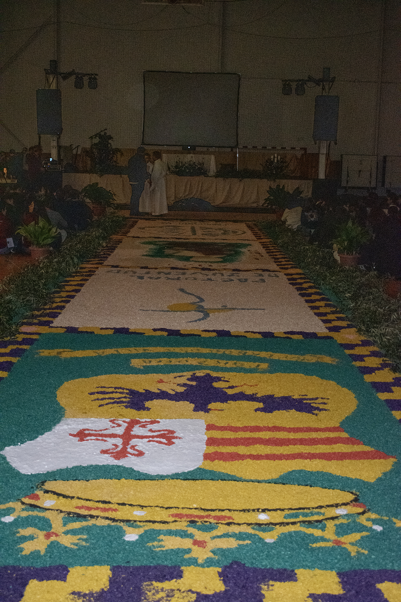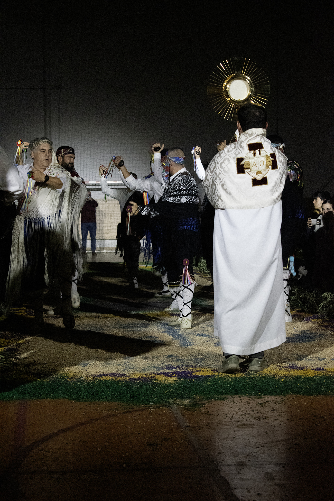 Al final de la vigilia, tras la bendición con el Santísimo, se hizo la reserva acompañada por los danzantes de Porzuna, que cada año acompañan al Santísimo en el Corpus Christi por las calles de la localidad. Y lo hicieron también sobre una alfombra, arte efímero que brinda la localidad cada año al Señor en la solemnidad del Cuerpo y la Sangre de Cristo.