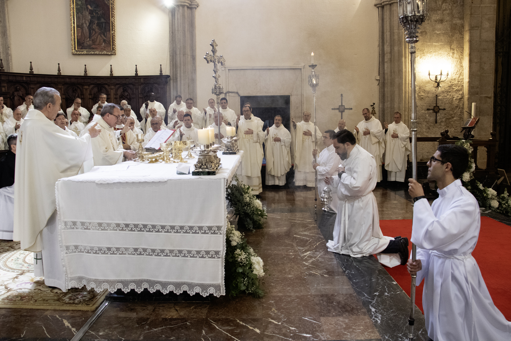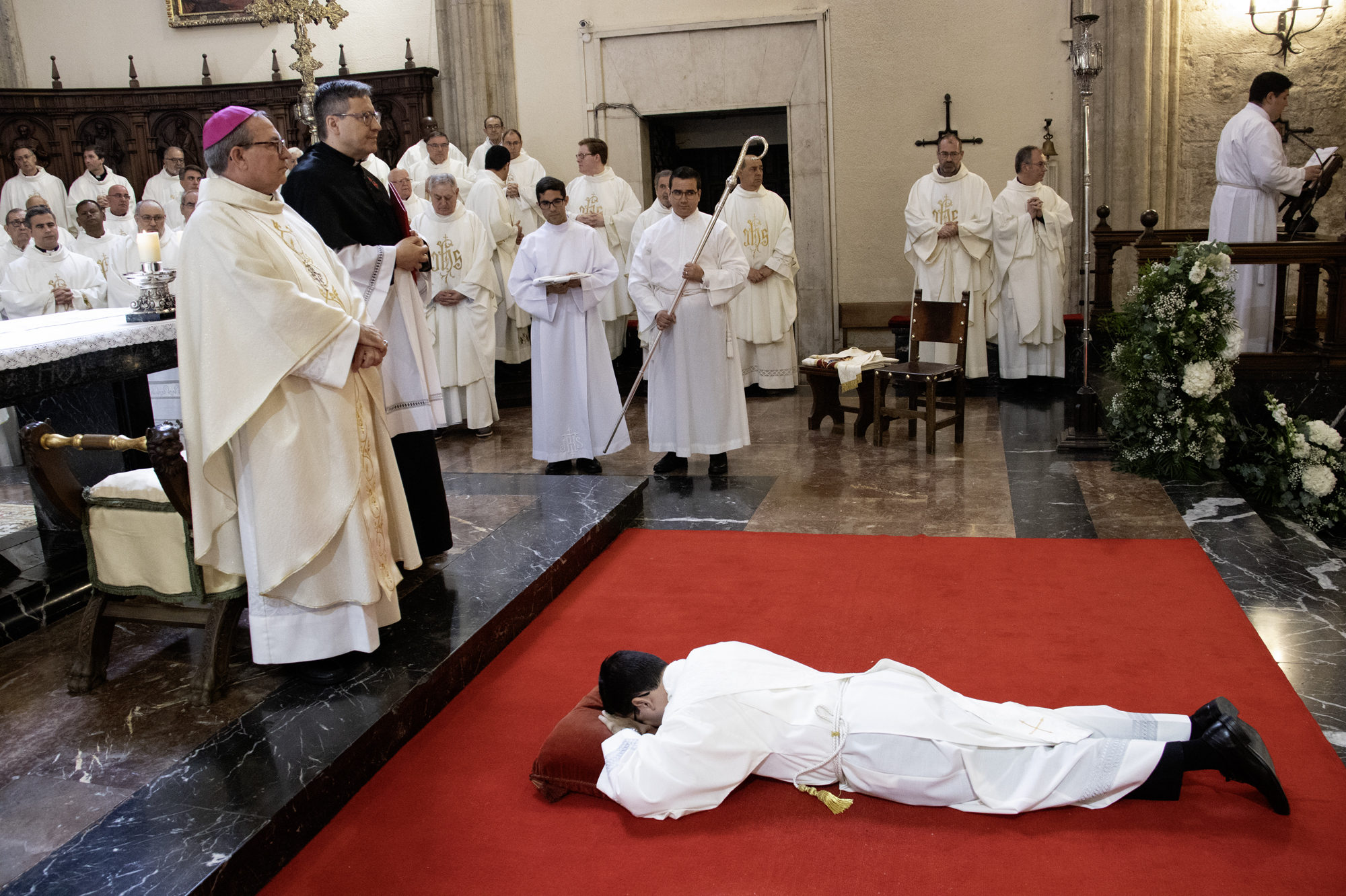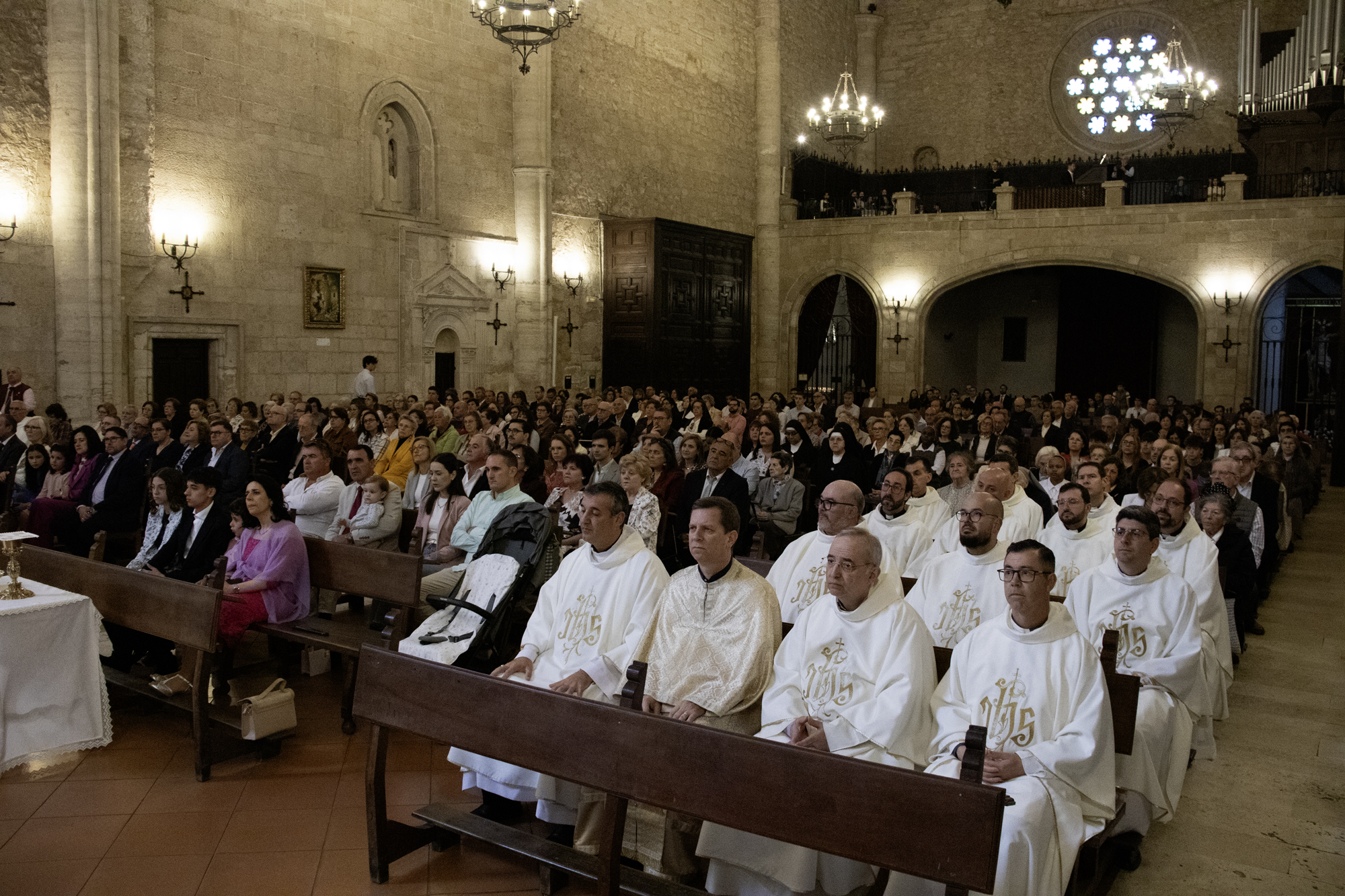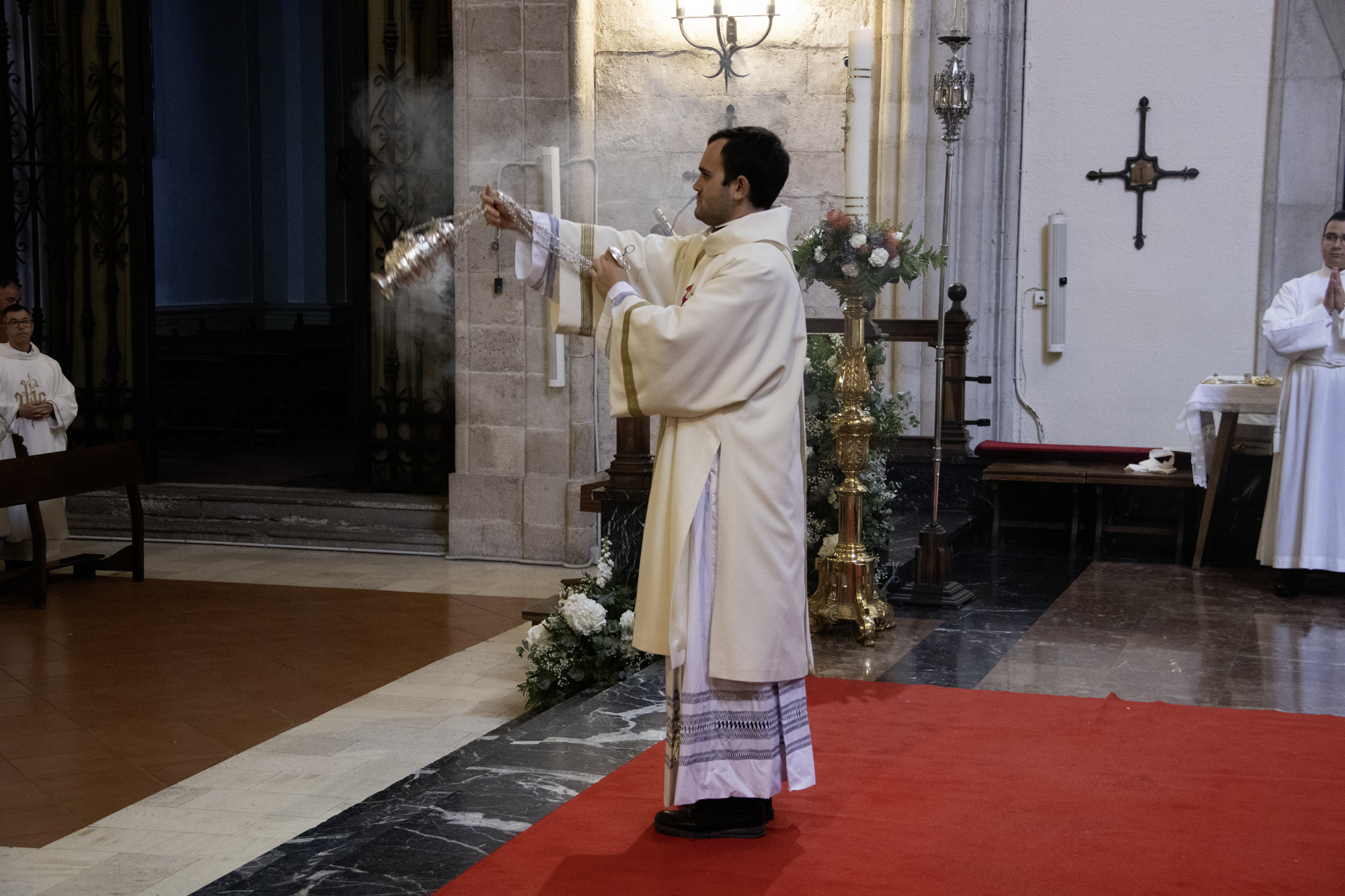 En las letanías de los santos, Diego se postró rostro en tierra ante el altar, mientras toda la asamblea —de pie, al estar en tiempo pascual— invocaba la intercesión de la Iglesia celestial. Después llegó el momento central de la ordenación: la imposición de manos por parte del obispo, gesto que después repitieron los sacerdotes presentes, y la plegaria de ordenación, por la que Diego Plana quedó constituido sacerdote para el servicio de la Iglesia.
