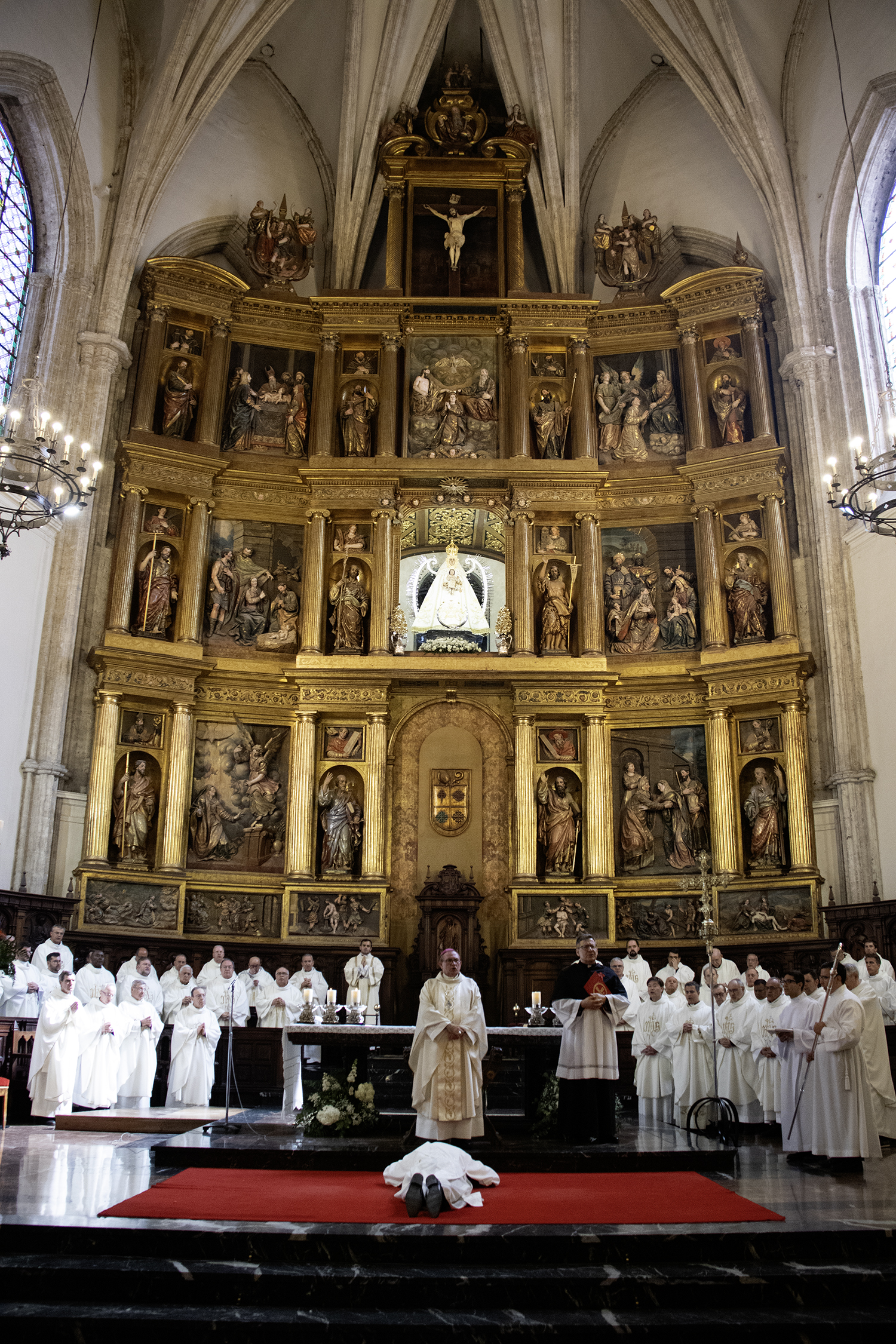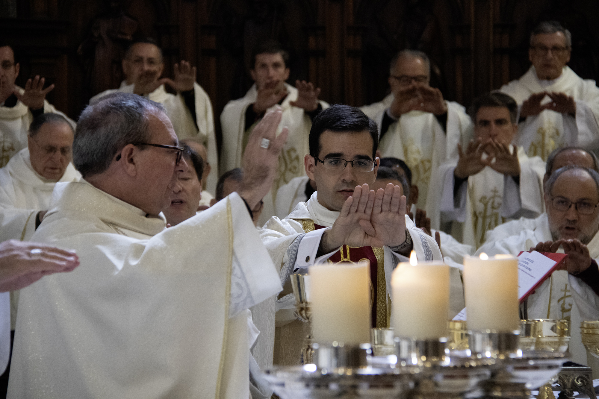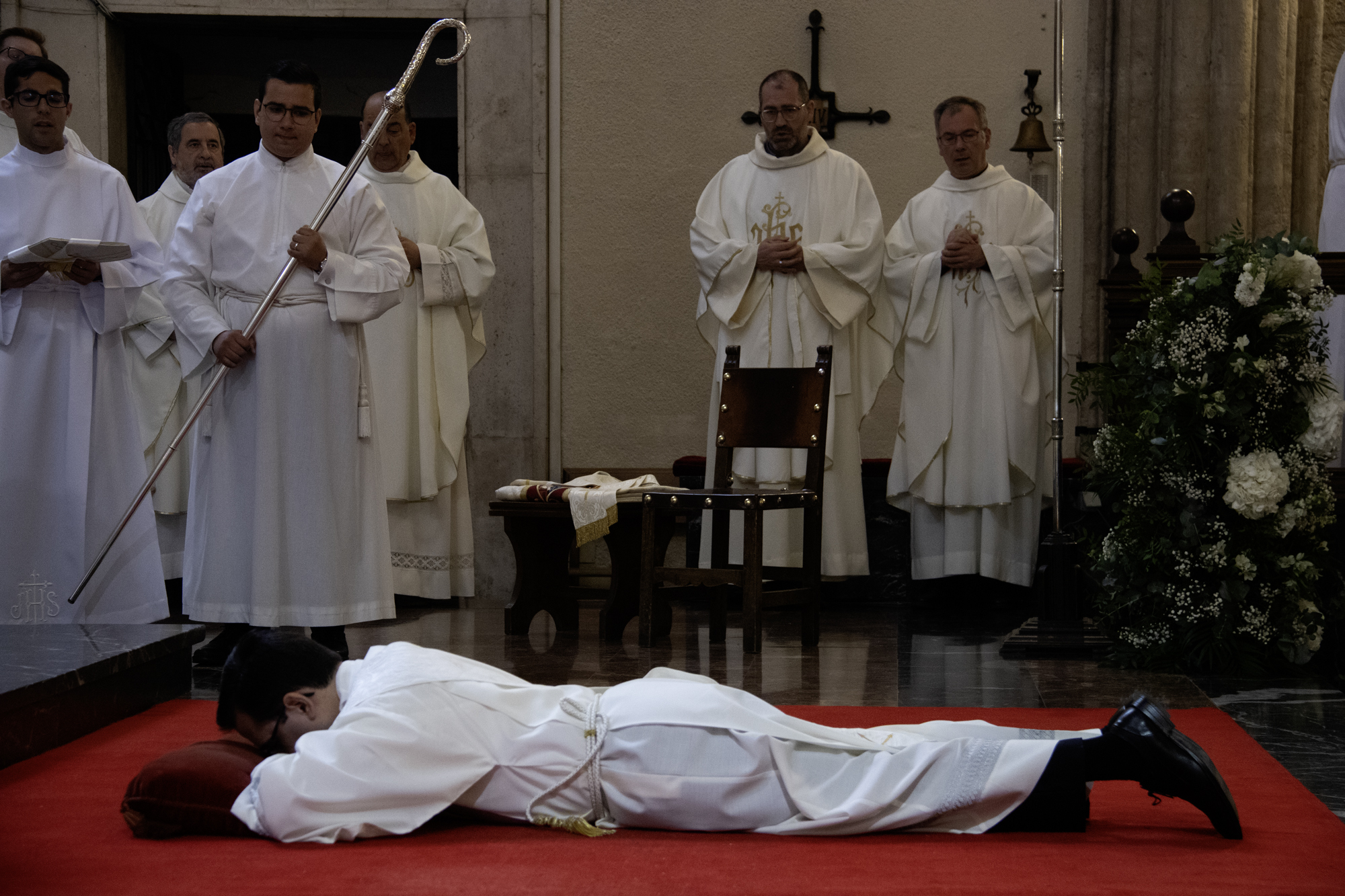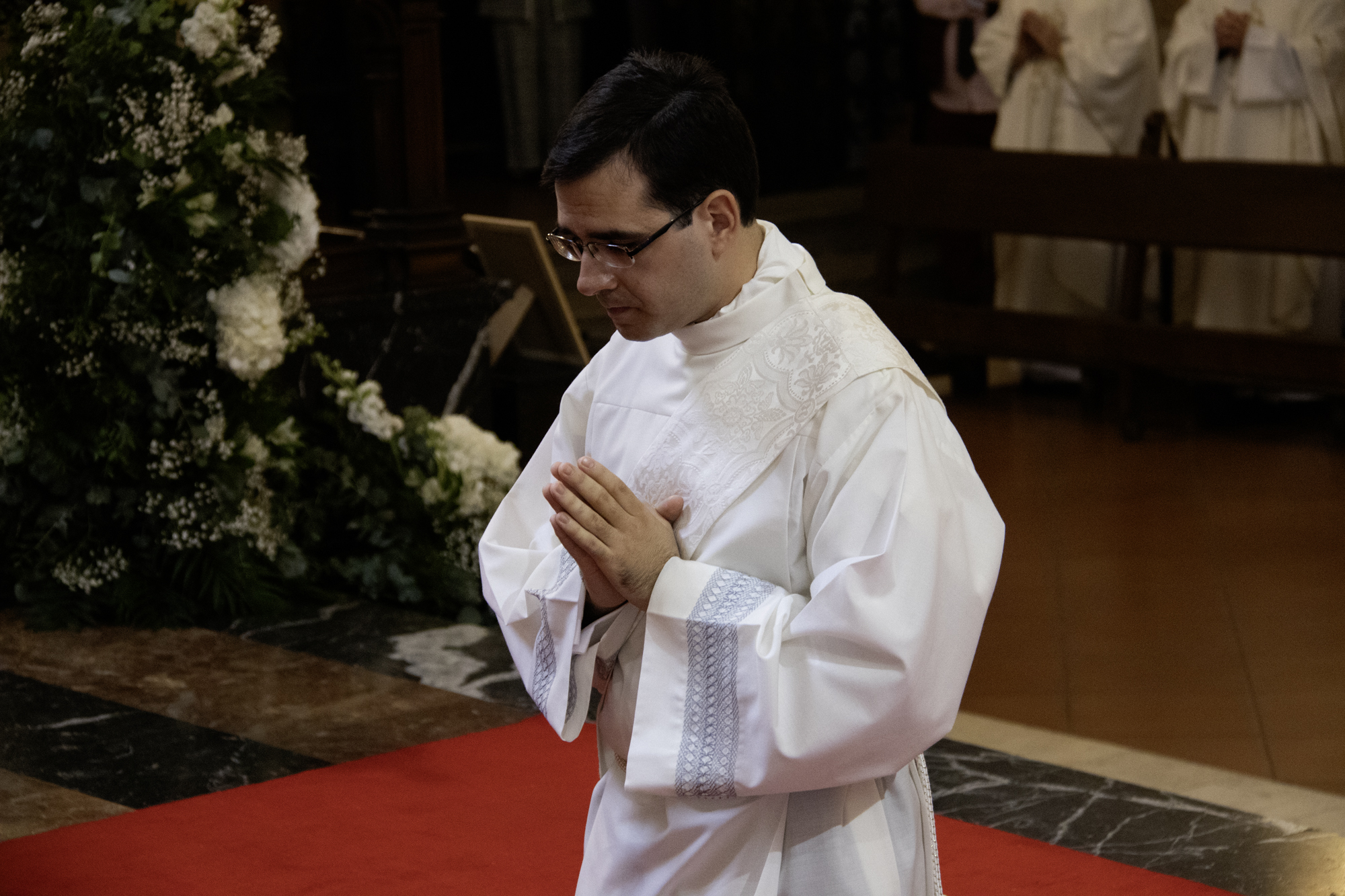 En las letanías de los santos, Diego se postró rostro en tierra ante el altar, mientras toda la asamblea —de pie, al estar en tiempo pascual— invocaba la intercesión de la Iglesia celestial. Después llegó el momento central de la ordenación: la imposición de manos por parte del obispo, gesto que después repitieron los sacerdotes presentes, y la plegaria de ordenación, por la que Diego Plana quedó constituido sacerdote para el servicio de la Iglesia.