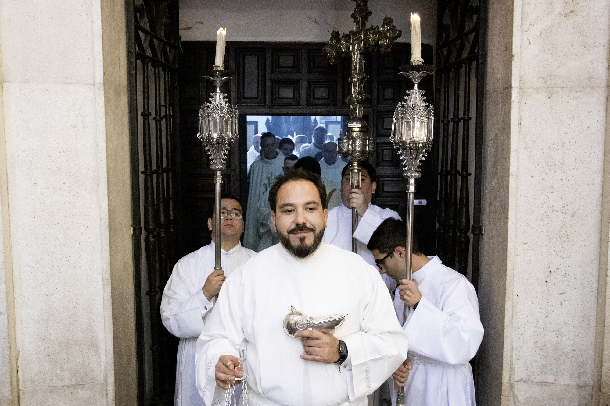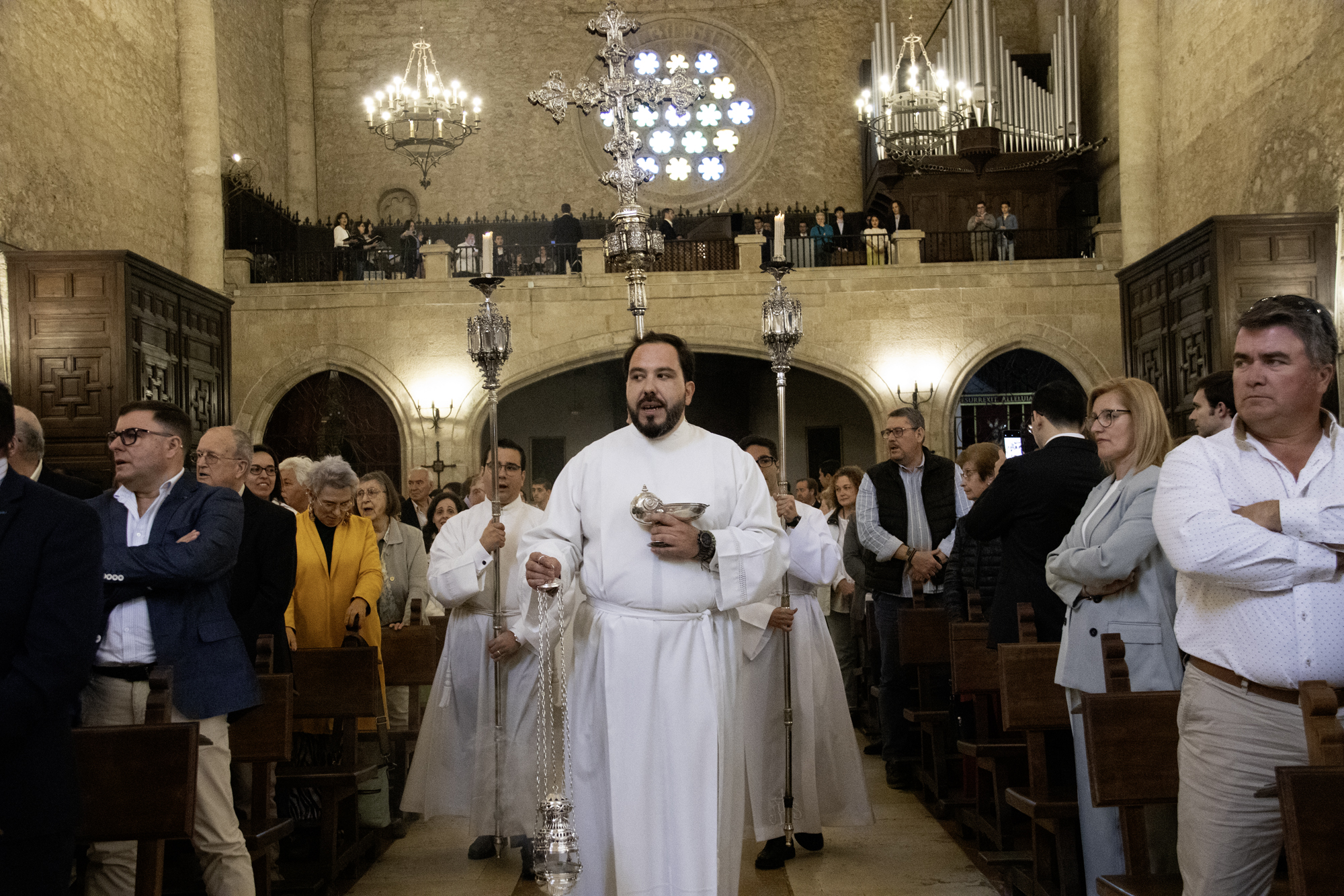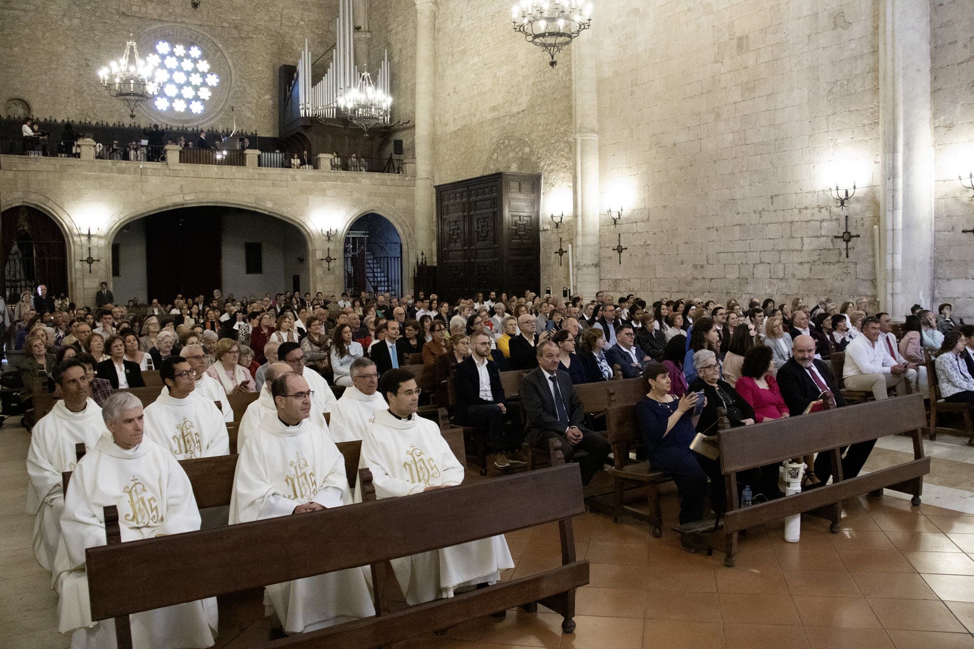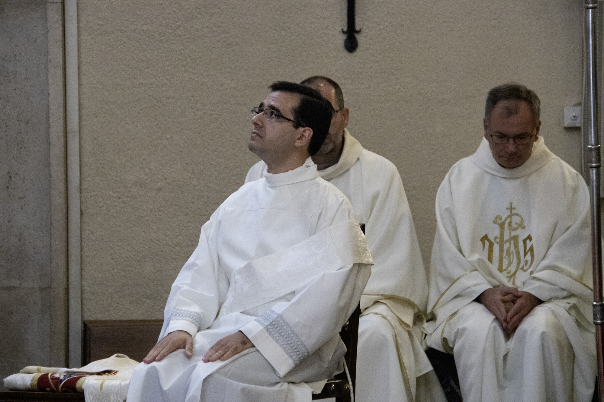 En las letanías de los santos, Diego se postró rostro en tierra ante el altar, mientras toda la asamblea —de pie, al estar en tiempo pascual— invocaba la intercesión de la Iglesia celestial. Después llegó el momento central de la ordenación: la imposición de manos por parte del obispo, gesto que después repitieron los sacerdotes presentes, y la plegaria de ordenación, por la que Diego Plana quedó constituido sacerdote para el servicio de la Iglesia.