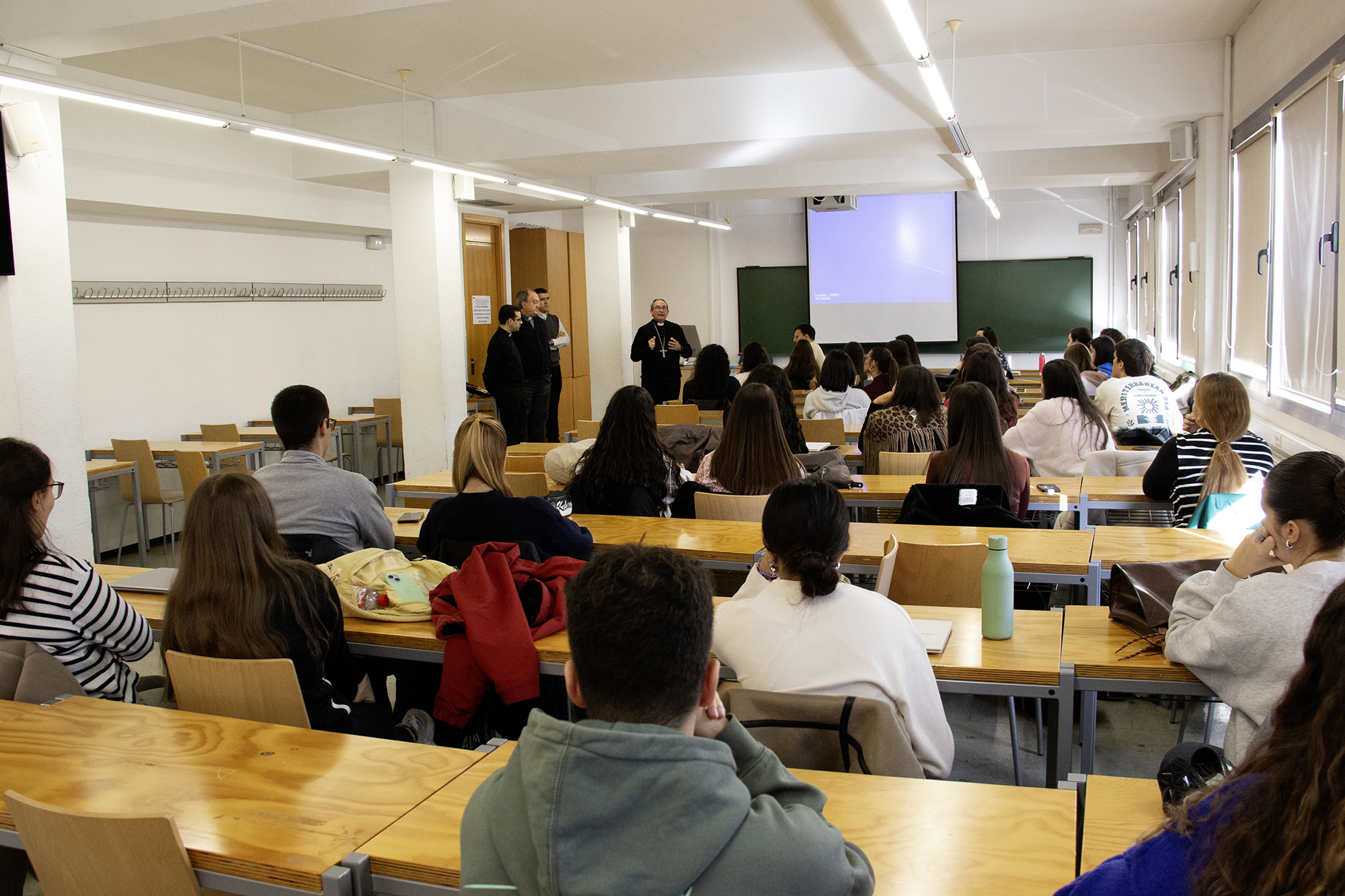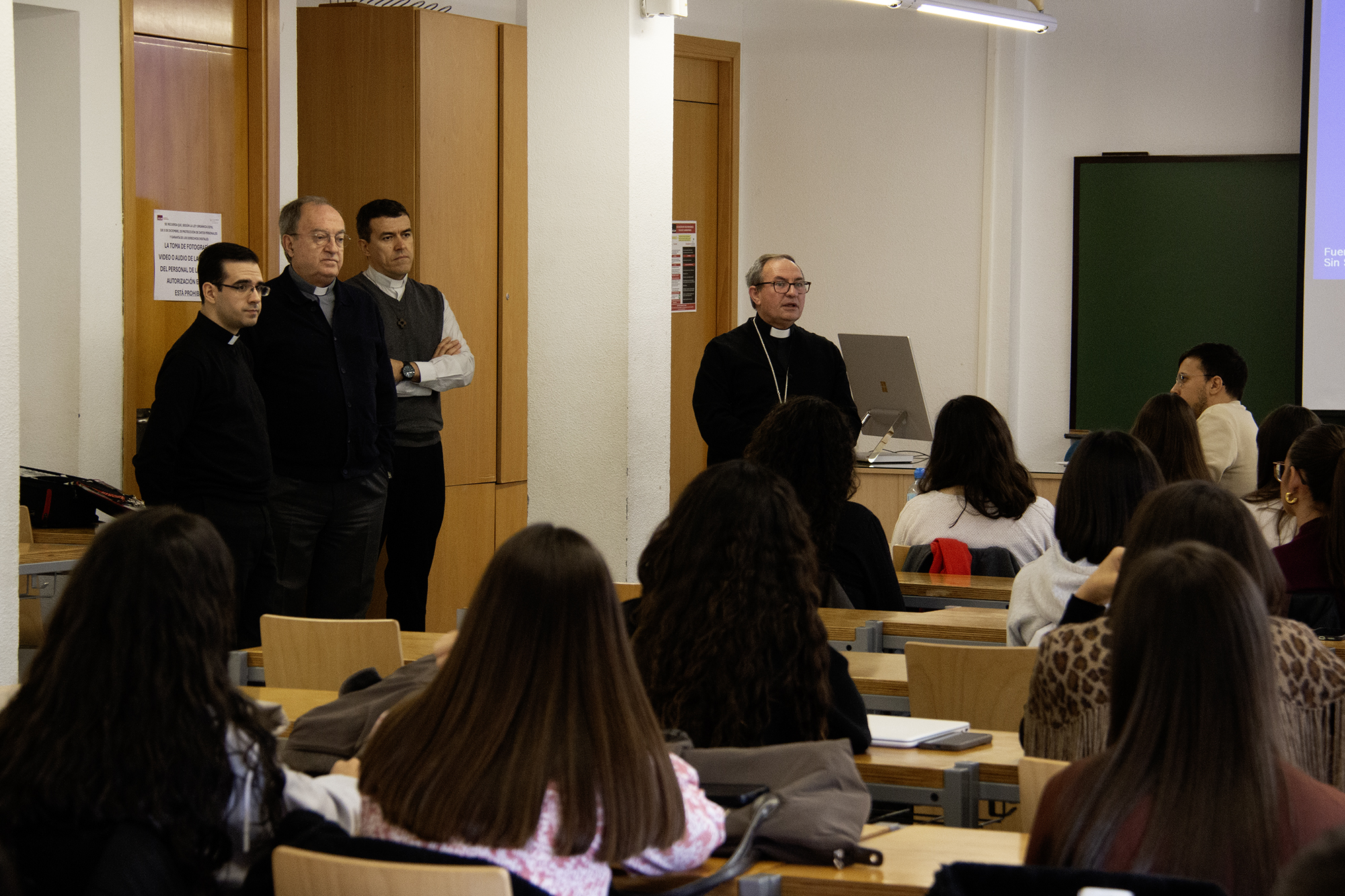 El obispo ofreció a los alumnos una visión de conjunto «para mirar al futuro» en el caso de quienes vayan a ejercer como maestros de Religión. En su intervención, explicó el estatuto de la asignatura de Religión en el sistema educativo y subrayó la diferencia entre la clase de Religión y la catequesis, aclarando los objetivos y el marco propio de cada una. Además, se detuvo en la normativa vigente y en los convenios entre la Conferencia Episcopal y el Estado que permiten la presencia de la asignatura de Religión en los centros públicos. Tras su exposición, los alumnos tuvieron oportunidad de plantear diversas preguntas y compartir inquietudes relacionadas con la futura docencia.