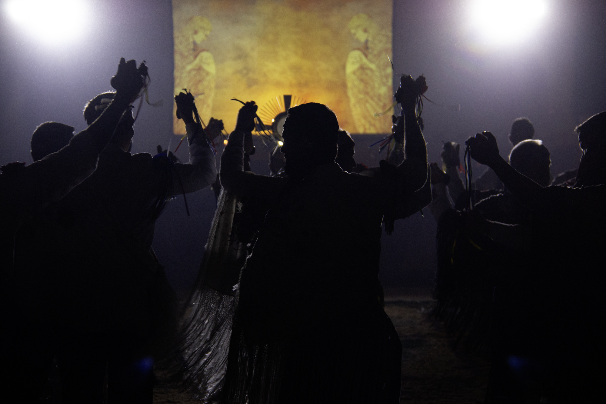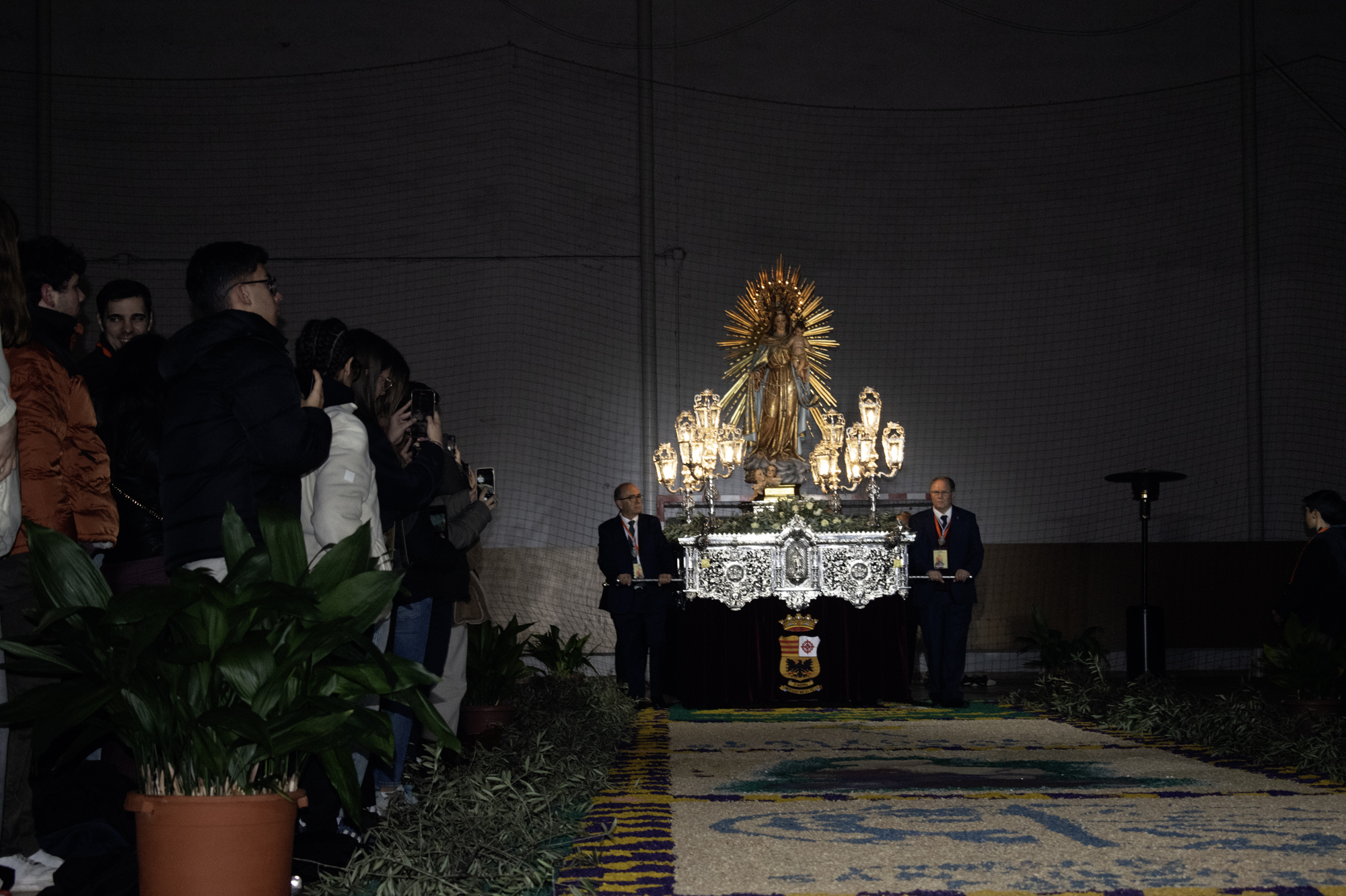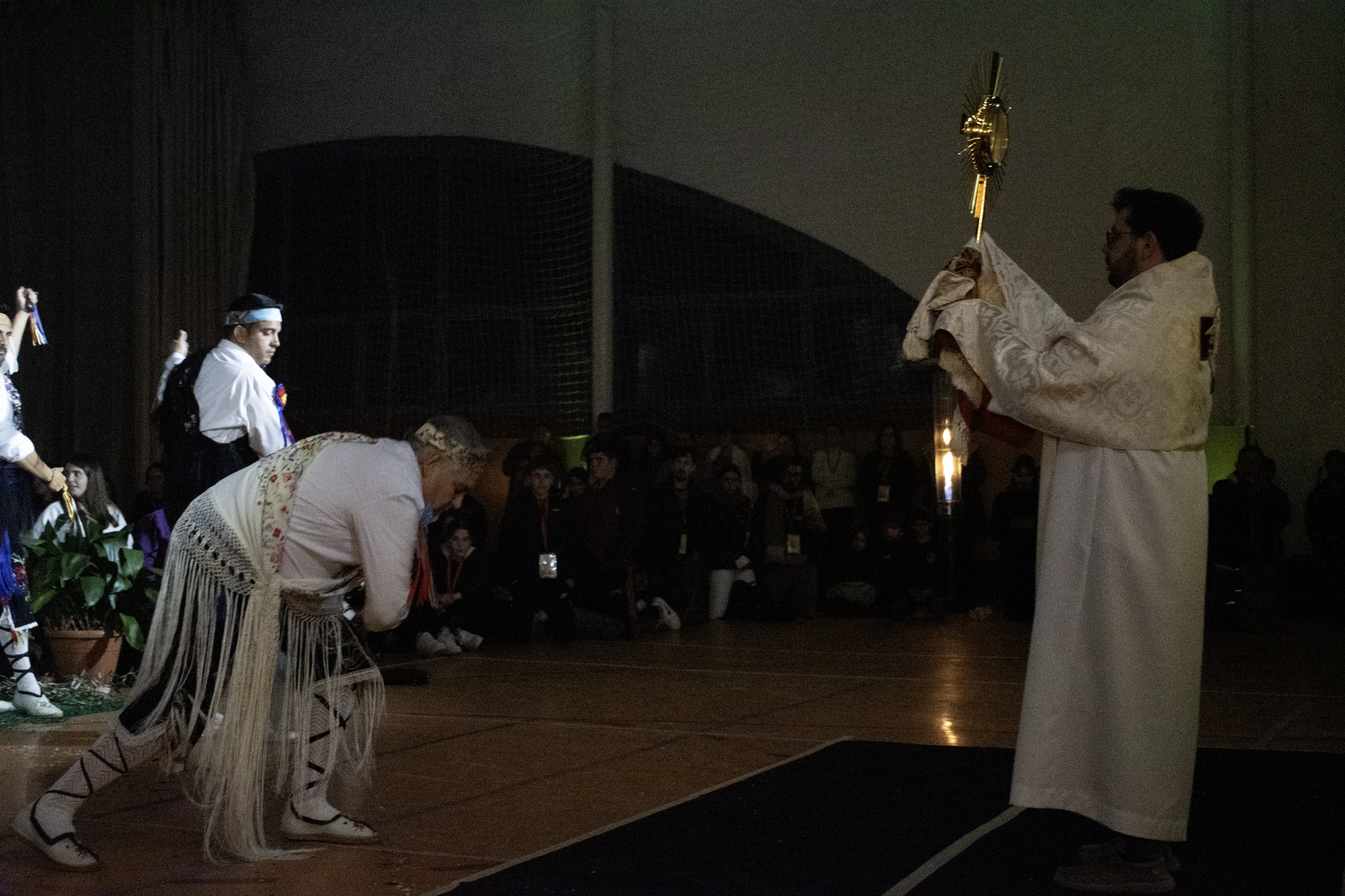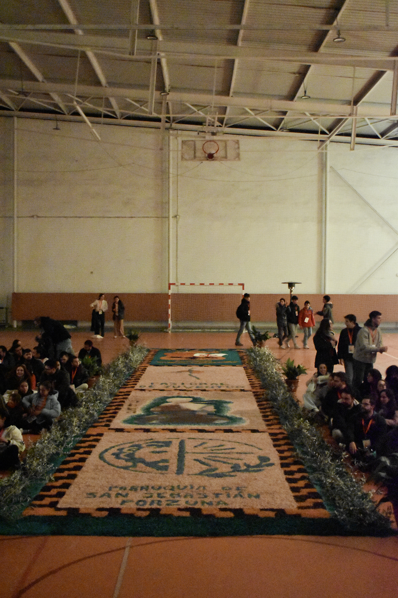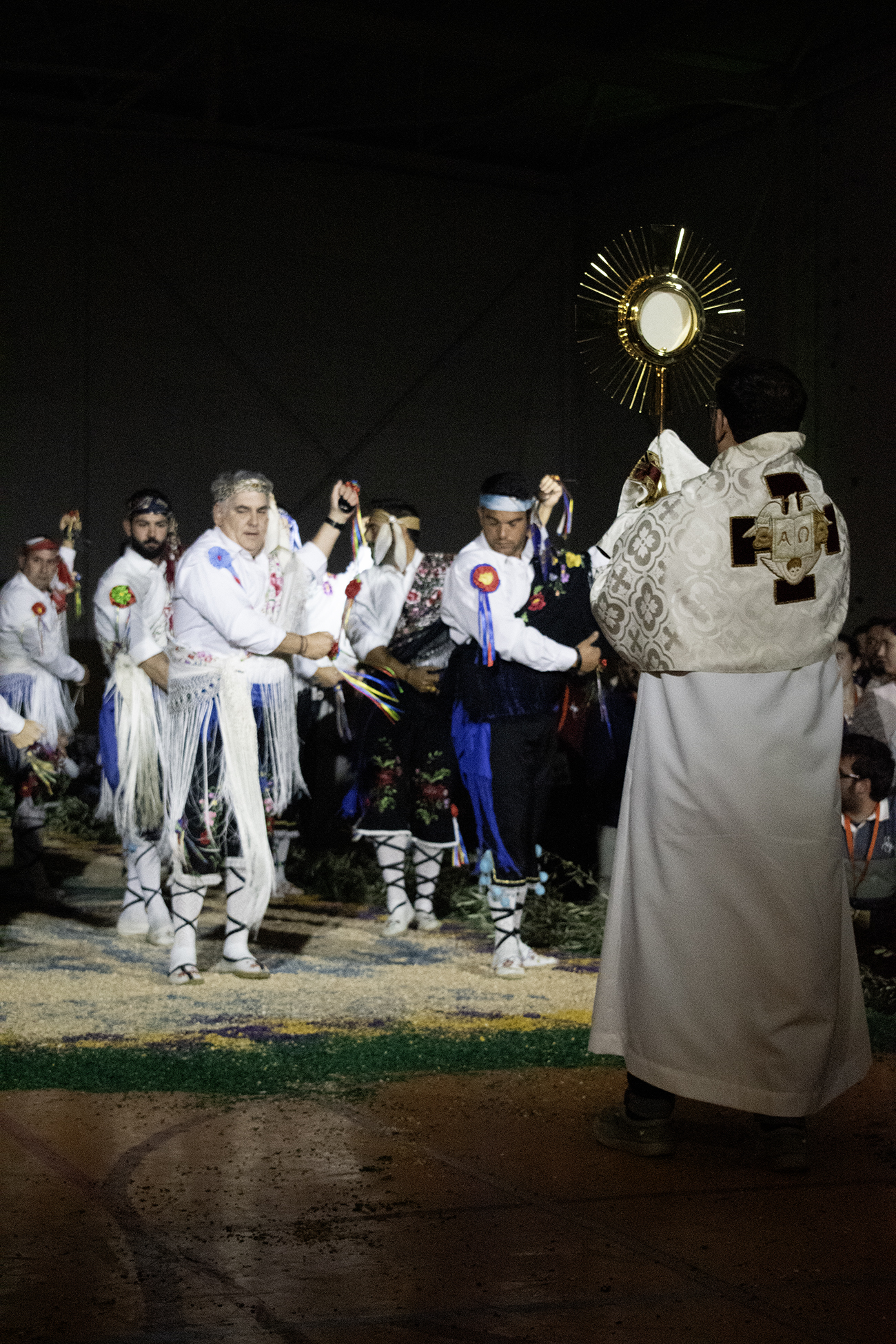 Al final de la vigilia, tras la bendición con el Santísimo, se hizo la reserva acompañada por los danzantes de Porzuna, que cada año acompañan al Santísimo en el Corpus Christi por las calles de la localidad. Y lo hicieron también sobre una alfombra, arte efímero que brinda la localidad cada año al Señor en la solemnidad del Cuerpo y la Sangre de Cristo.