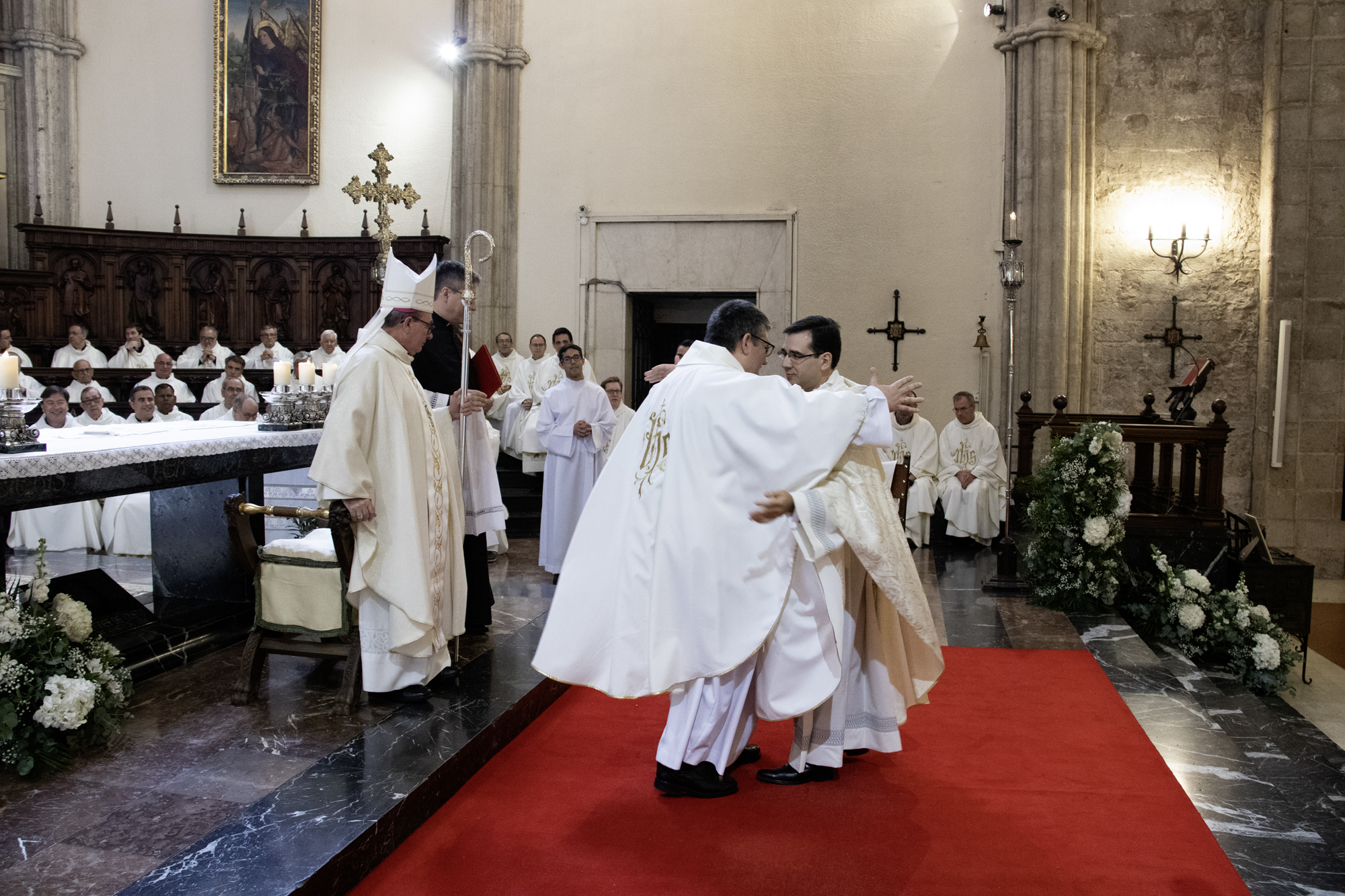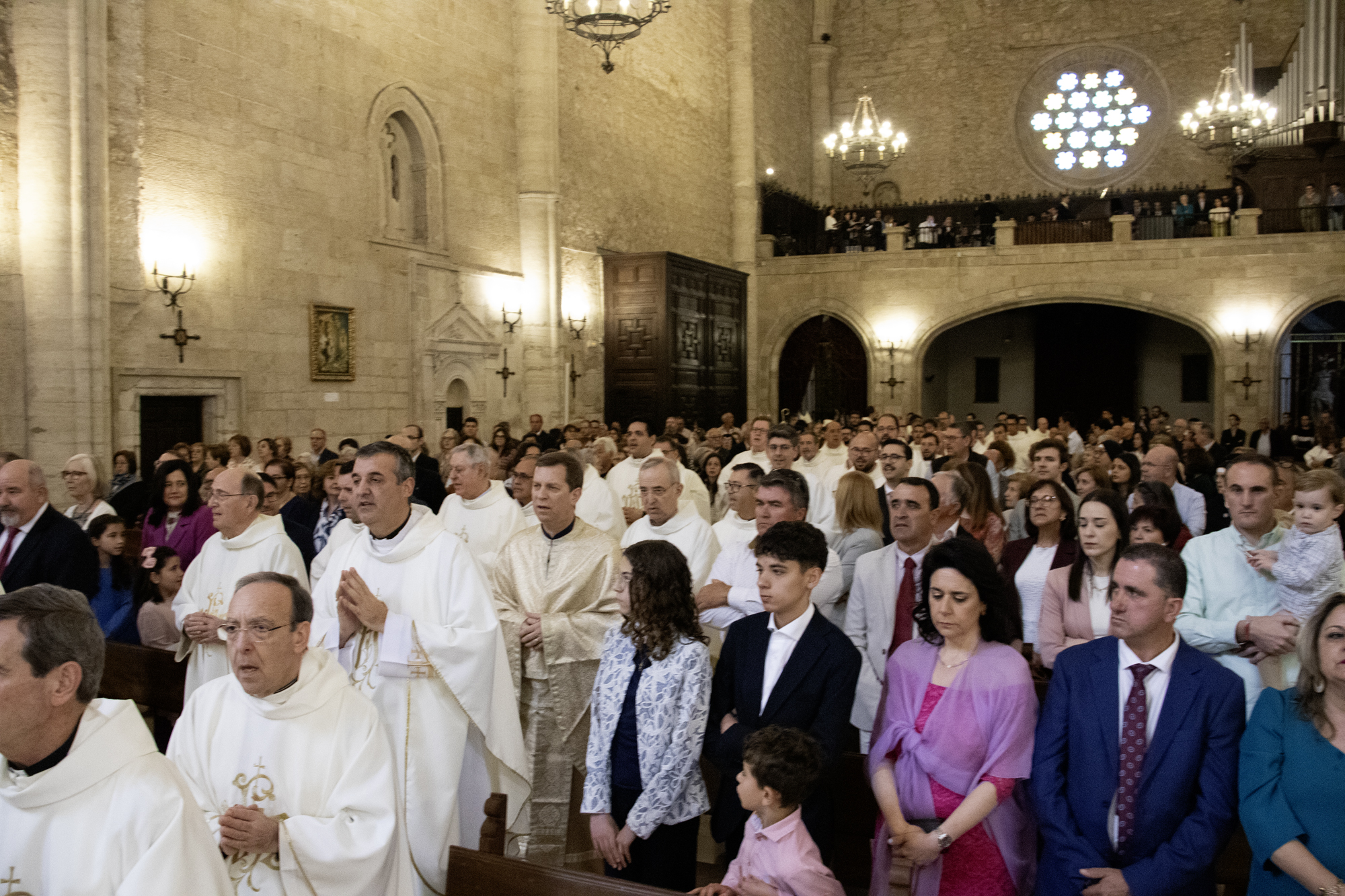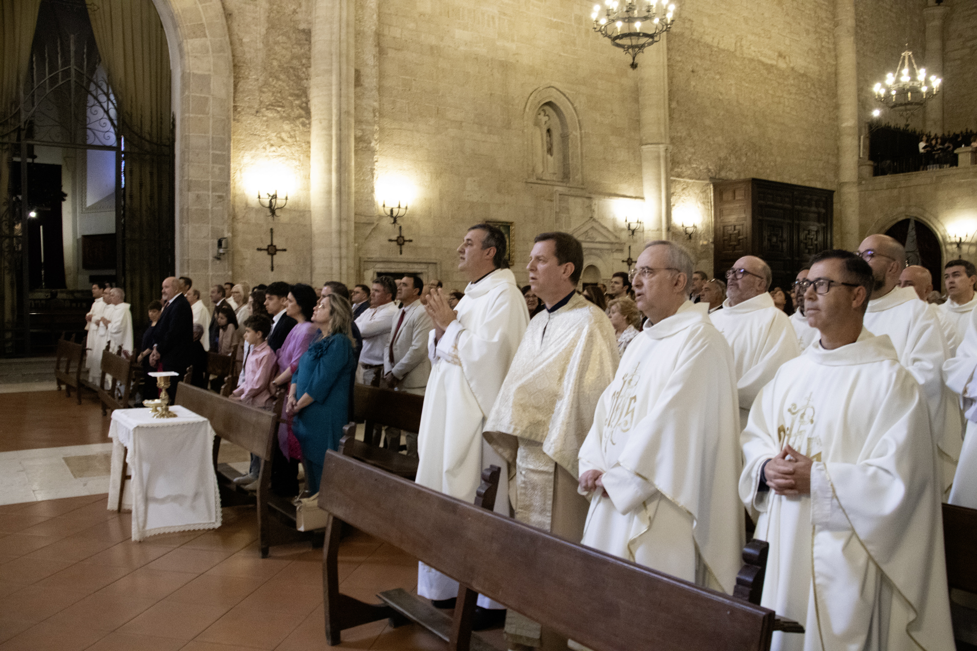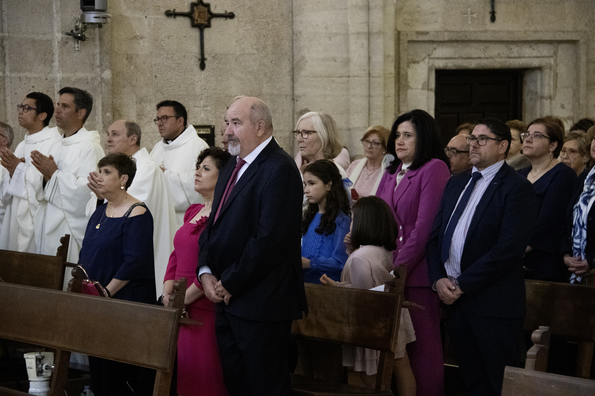 En las letanías de los santos, Diego se postró rostro en tierra ante el altar, mientras toda la asamblea —de pie, al estar en tiempo pascual— invocaba la intercesión de la Iglesia celestial. Después llegó el momento central de la ordenación: la imposición de manos por parte del obispo, gesto que después repitieron los sacerdotes presentes, y la plegaria de ordenación, por la que Diego Plana quedó constituido sacerdote para el servicio de la Iglesia.