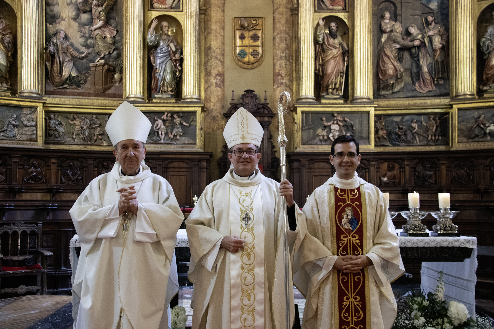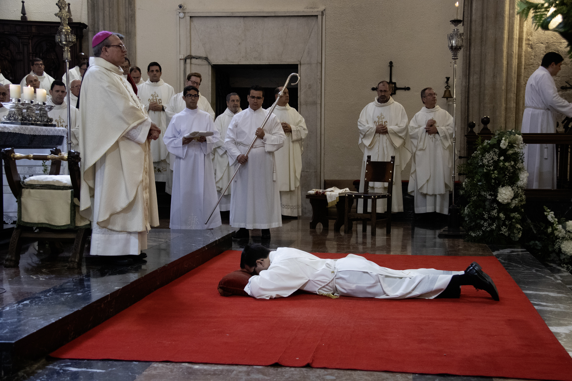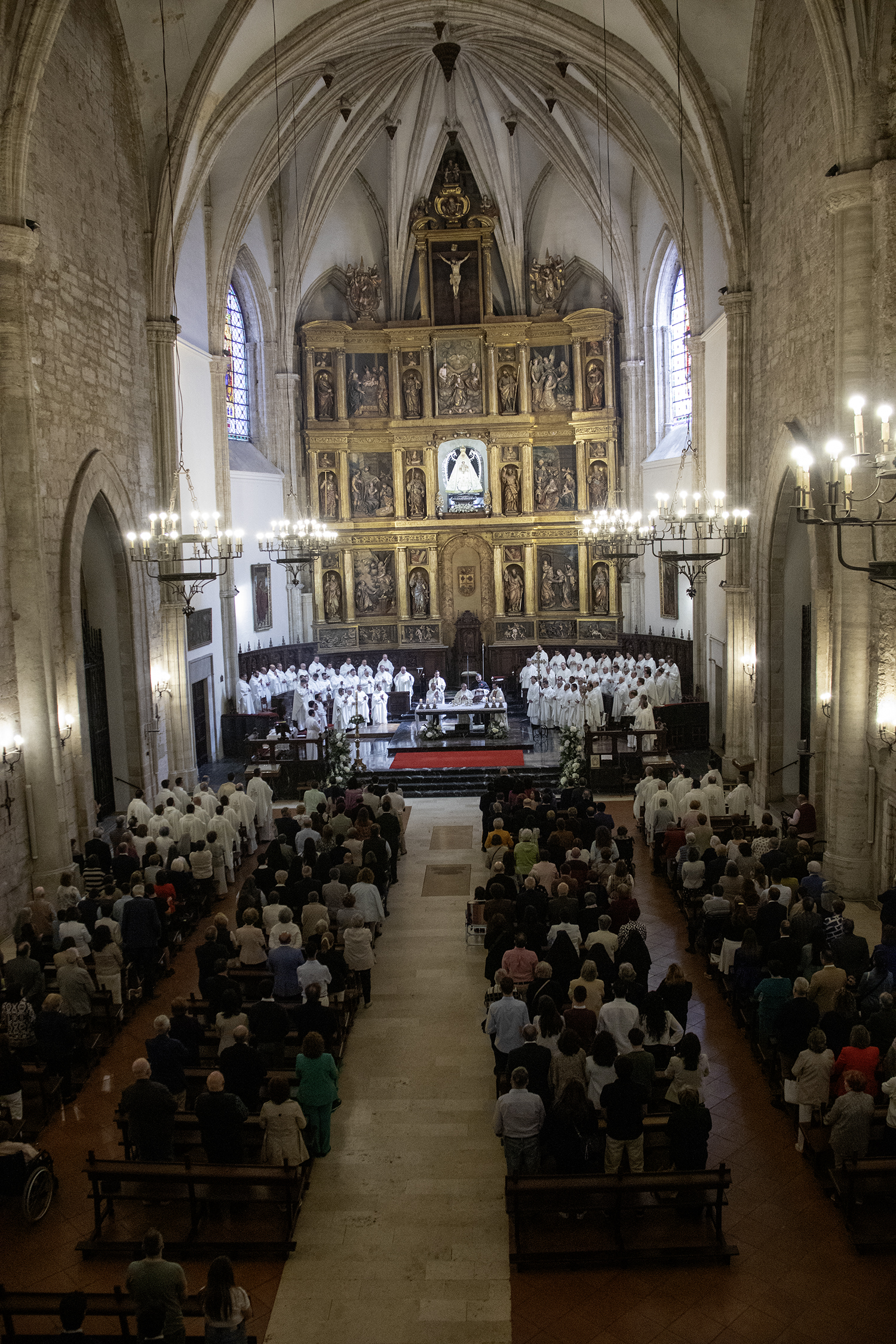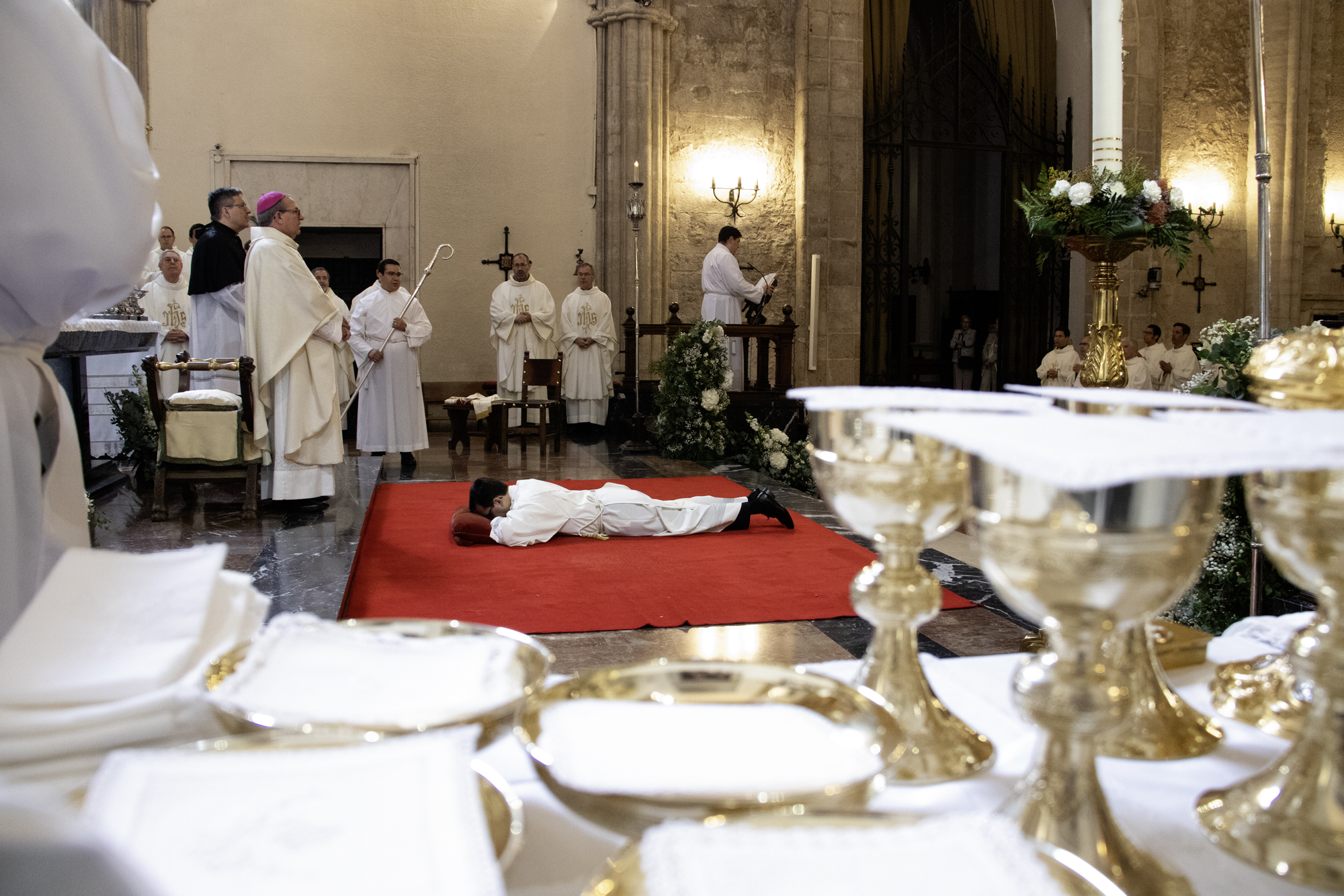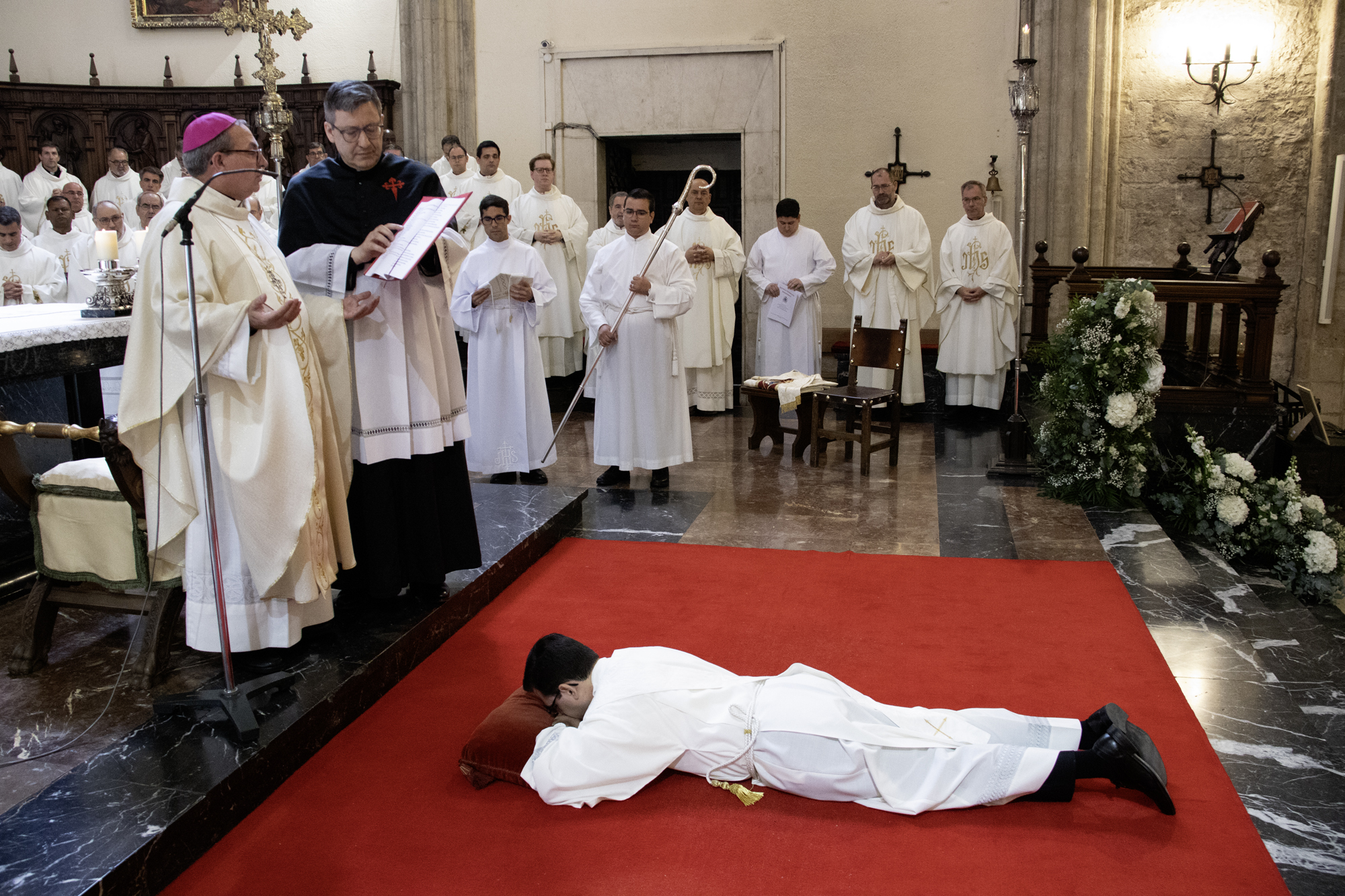 En las letanías de los santos, Diego se postró rostro en tierra ante el altar, mientras toda la asamblea —de pie, al estar en tiempo pascual— invocaba la intercesión de la Iglesia celestial. Después llegó el momento central de la ordenación: la imposición de manos por parte del obispo, gesto que después repitieron los sacerdotes presentes, y la plegaria de ordenación, por la que Diego Plana quedó constituido sacerdote para el servicio de la Iglesia.