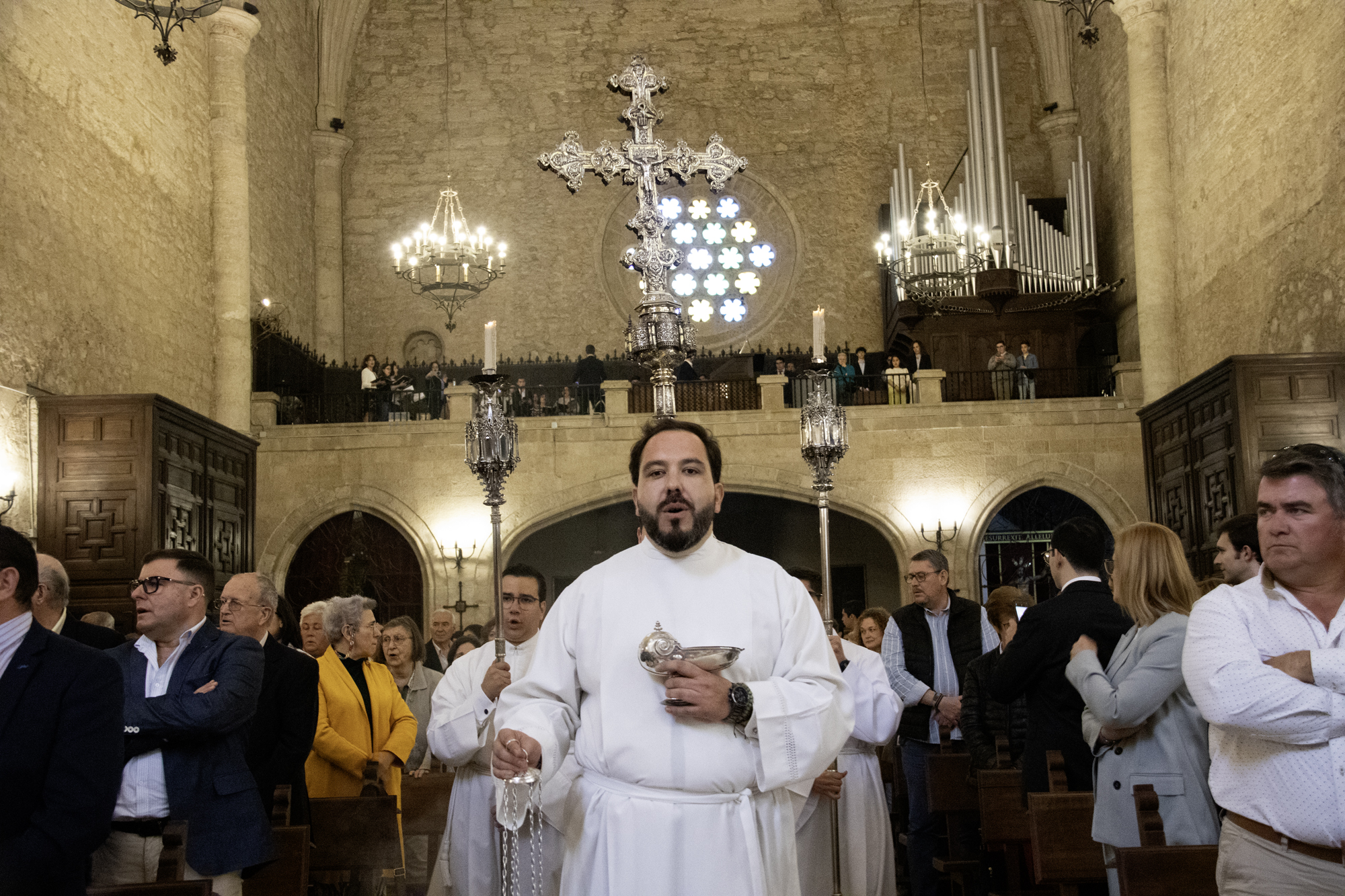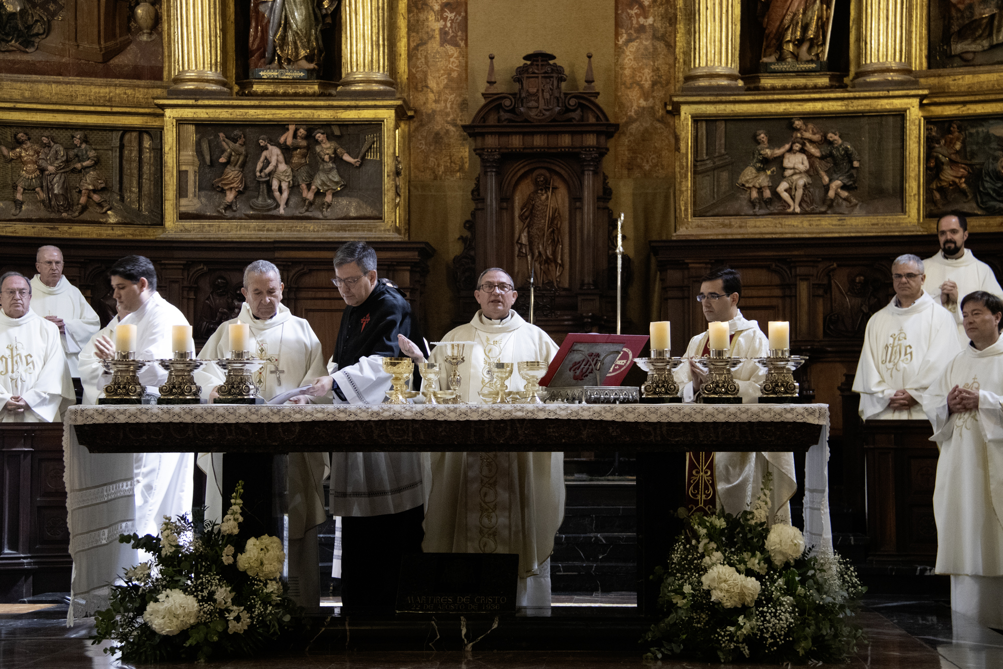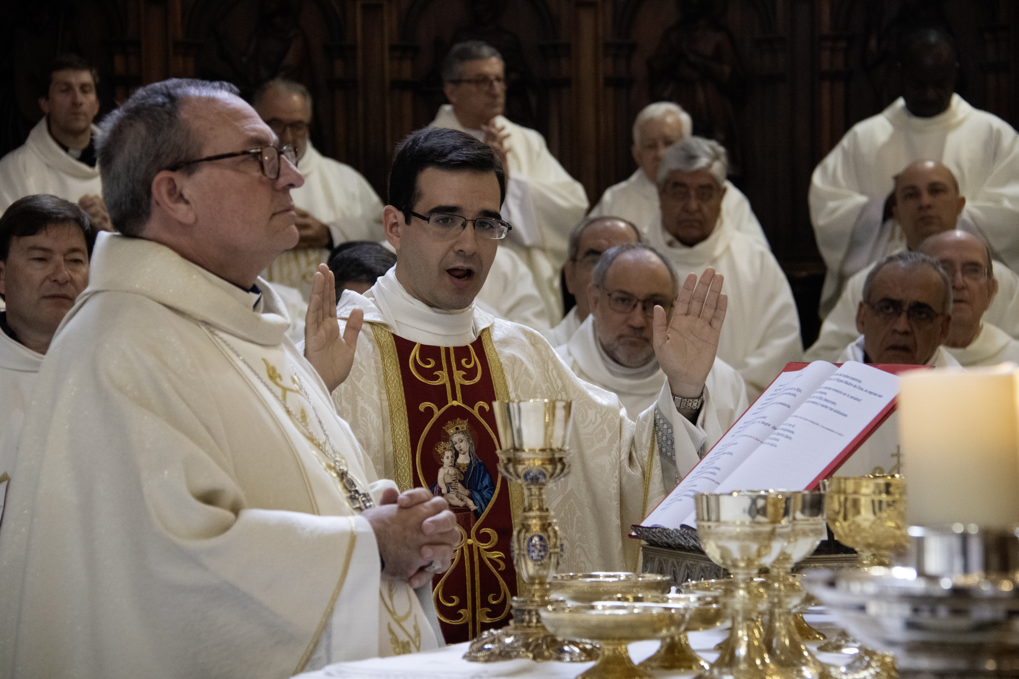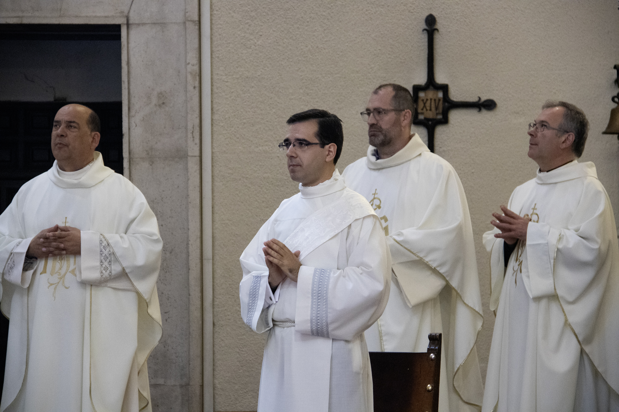 En las letanías de los santos, Diego se postró rostro en tierra ante el altar, mientras toda la asamblea —de pie, al estar en tiempo pascual— invocaba la intercesión de la Iglesia celestial. Después llegó el momento central de la ordenación: la imposición de manos por parte del obispo, gesto que después repitieron los sacerdotes presentes, y la plegaria de ordenación, por la que Diego Plana quedó constituido sacerdote para el servicio de la Iglesia.