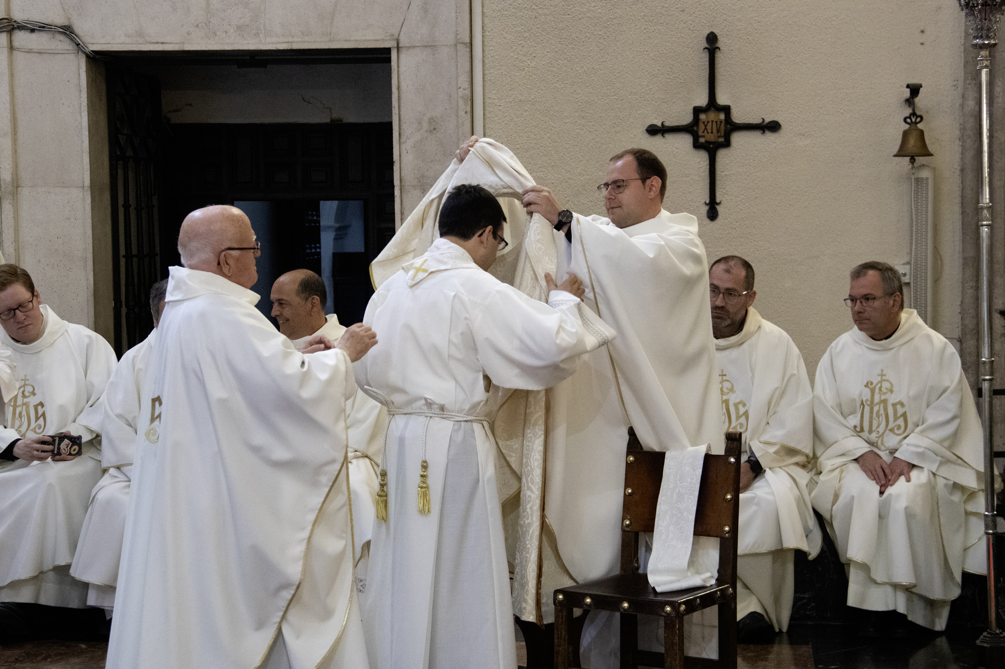 La liturgia continuó con los ritos explicativos propios de la ordenación presbiteral. El nuevo sacerdote fue revestido con la estola y la casulla, signos visibles de su nuevo ministerio; después, el obispo ungió con el santo crisma las palmas de sus manos, consagrándolas para bendecir, santificar y ofrecer el sacrificio eucarístico. Más tarde recibió la patena con el pan y el cáliz con el vino, encomendándosele así aquello que, desde ahora, presentará sacramentalmente en el altar. Finalmente, el obispo y los presbíteros le dieron el abrazo de paz, acogiéndolo en el presbiterio diocesano.
